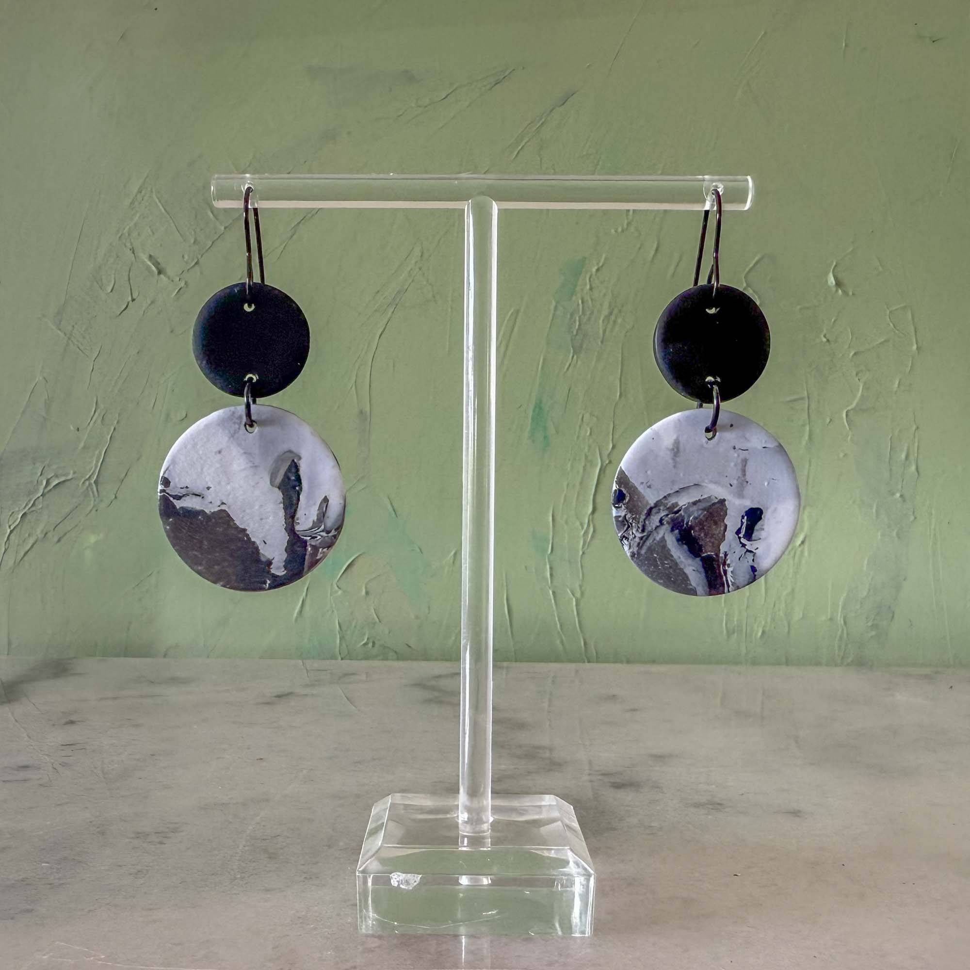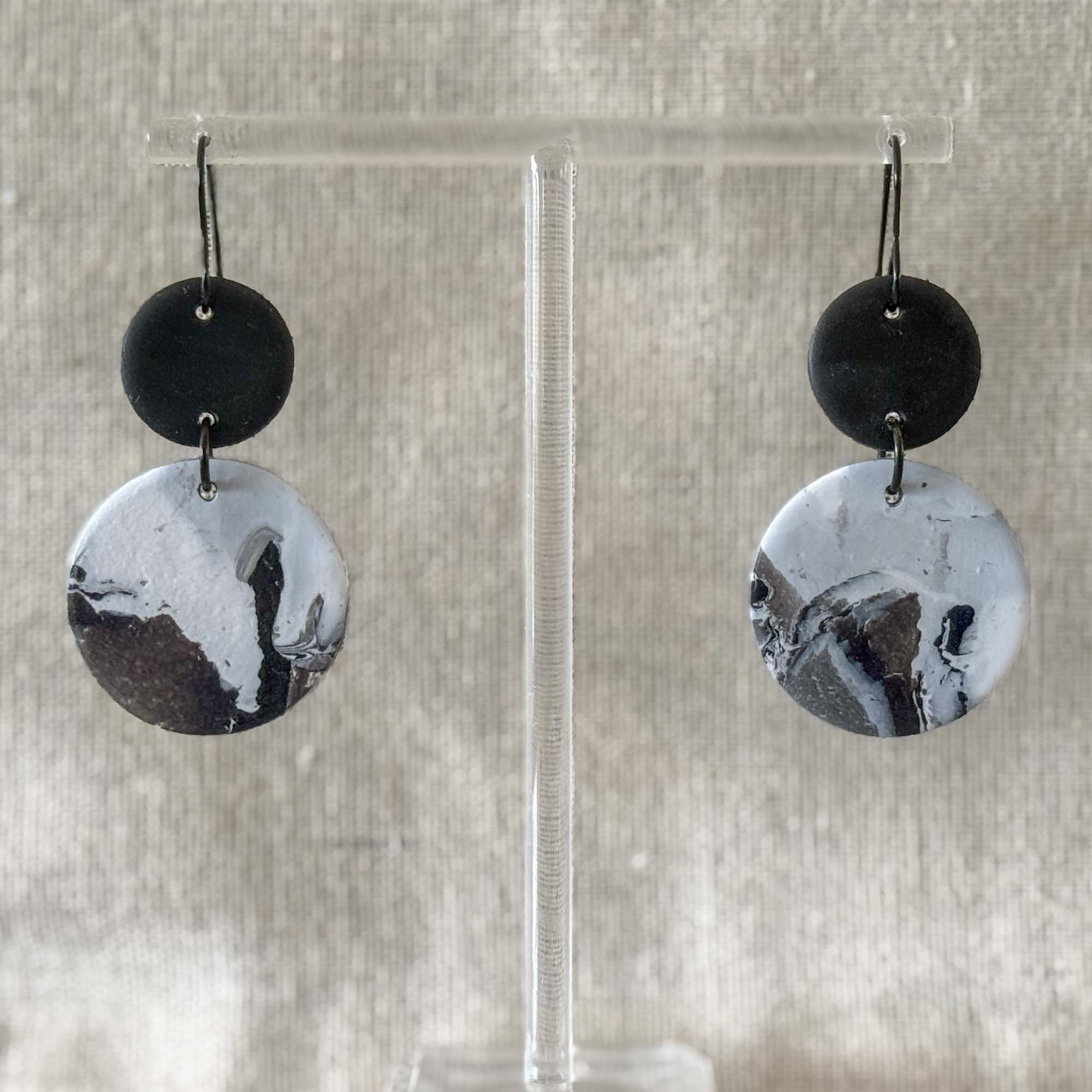 Black and white marble look large circle dangles on black hooks Made using polymer clay with stainless steel findings. Each earring weights 3 grams and measures 6cm in length (approx). NOTE: Although all care is taken when photographing products, colours in photos may vary and not be an exact representation of the item.