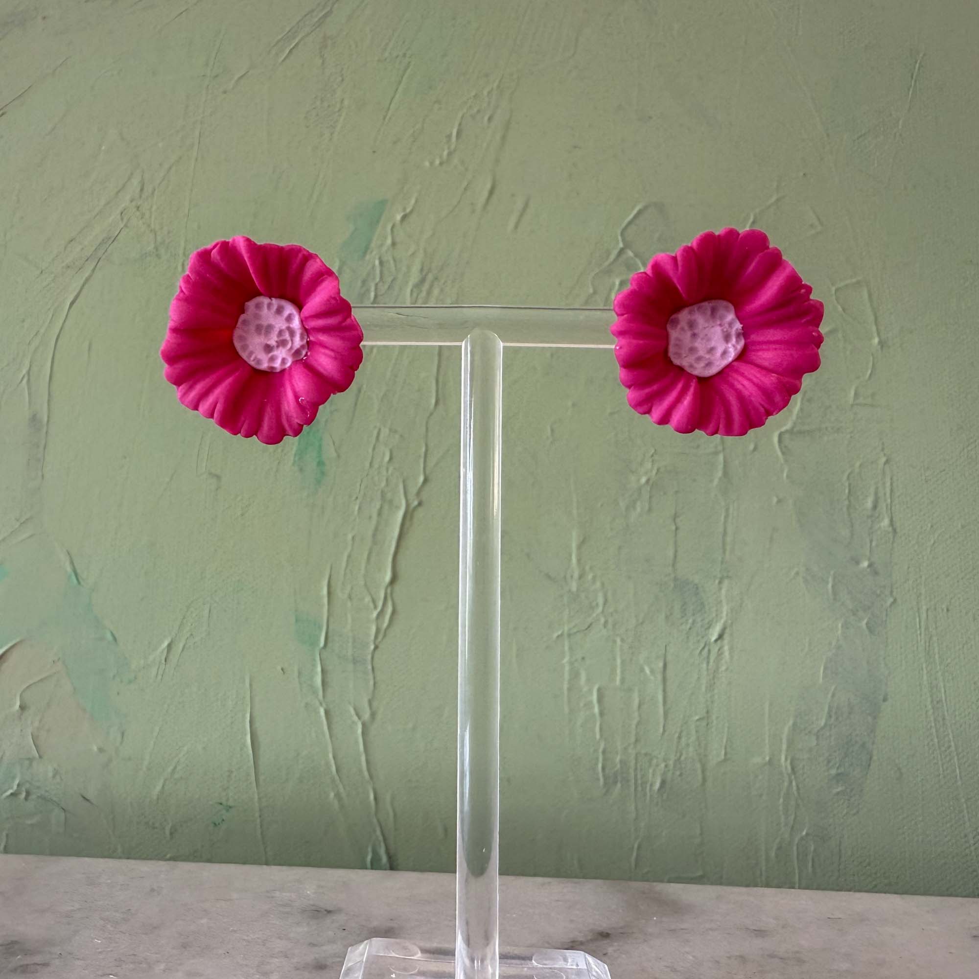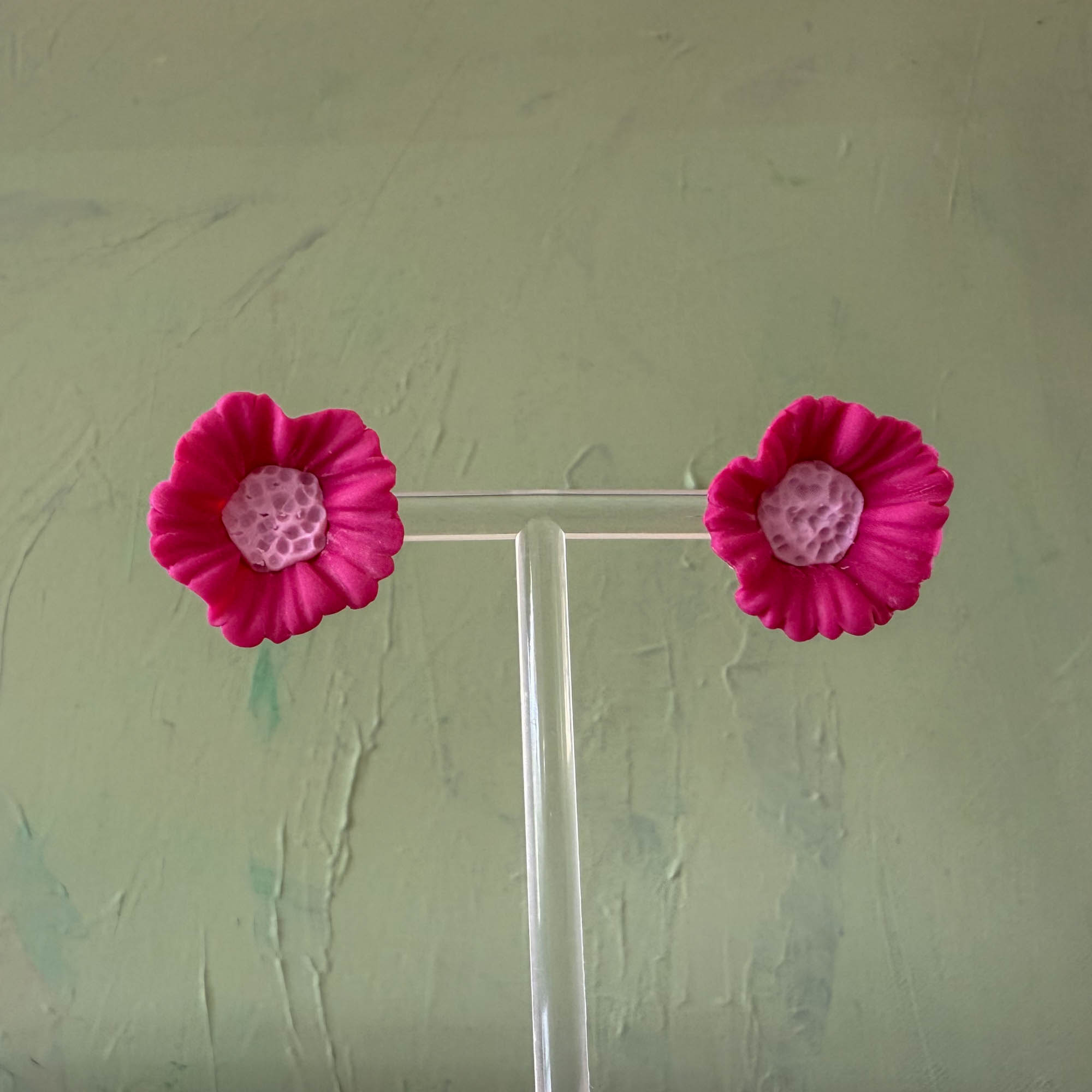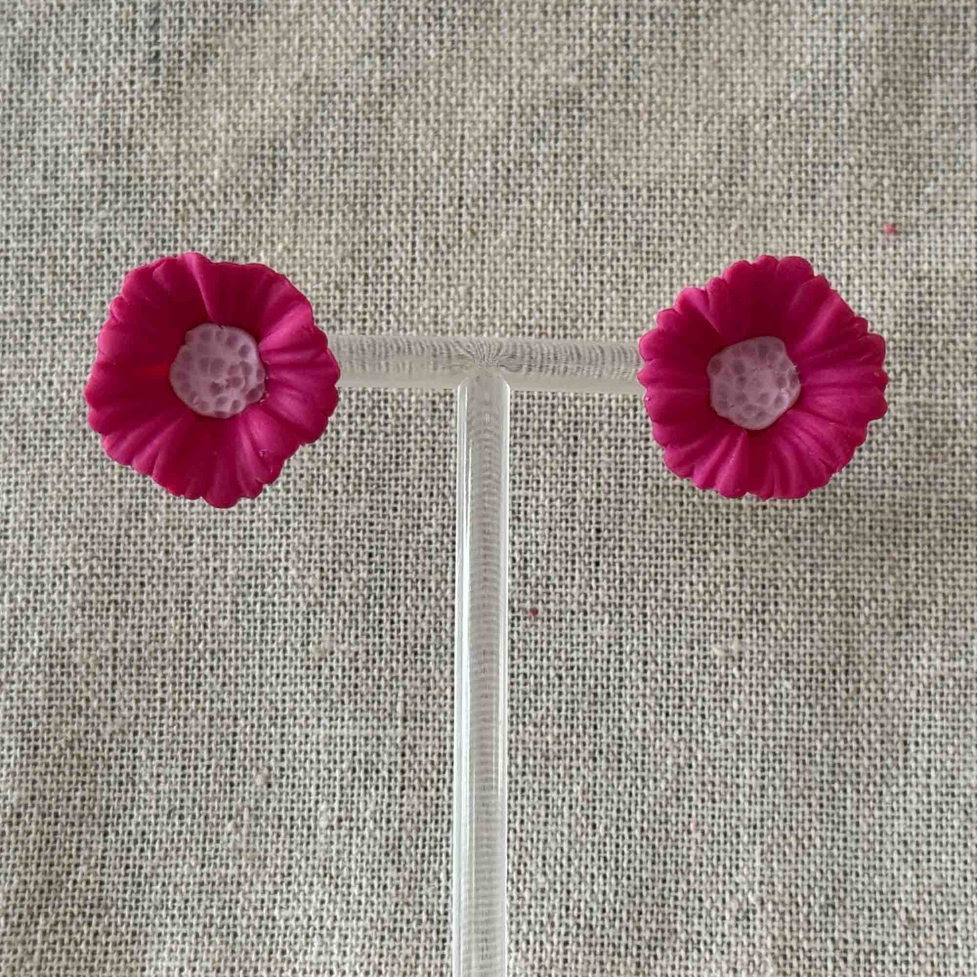 Dark pink daisy with light pink centre. Each earring weights 1.5 grams and measures 2.5cm diameter (approx). Handmade using polymer clay and stainless steel posts. NOTE: Although all care is taken when photographing products, colours in photos may vary and not be an exact representation of the item.