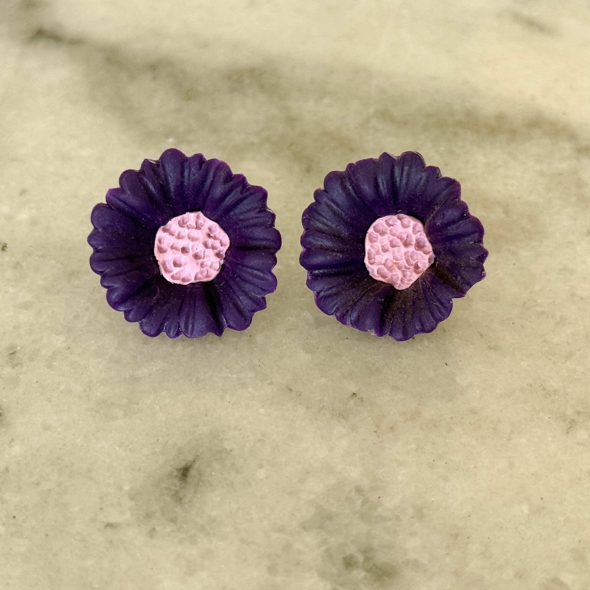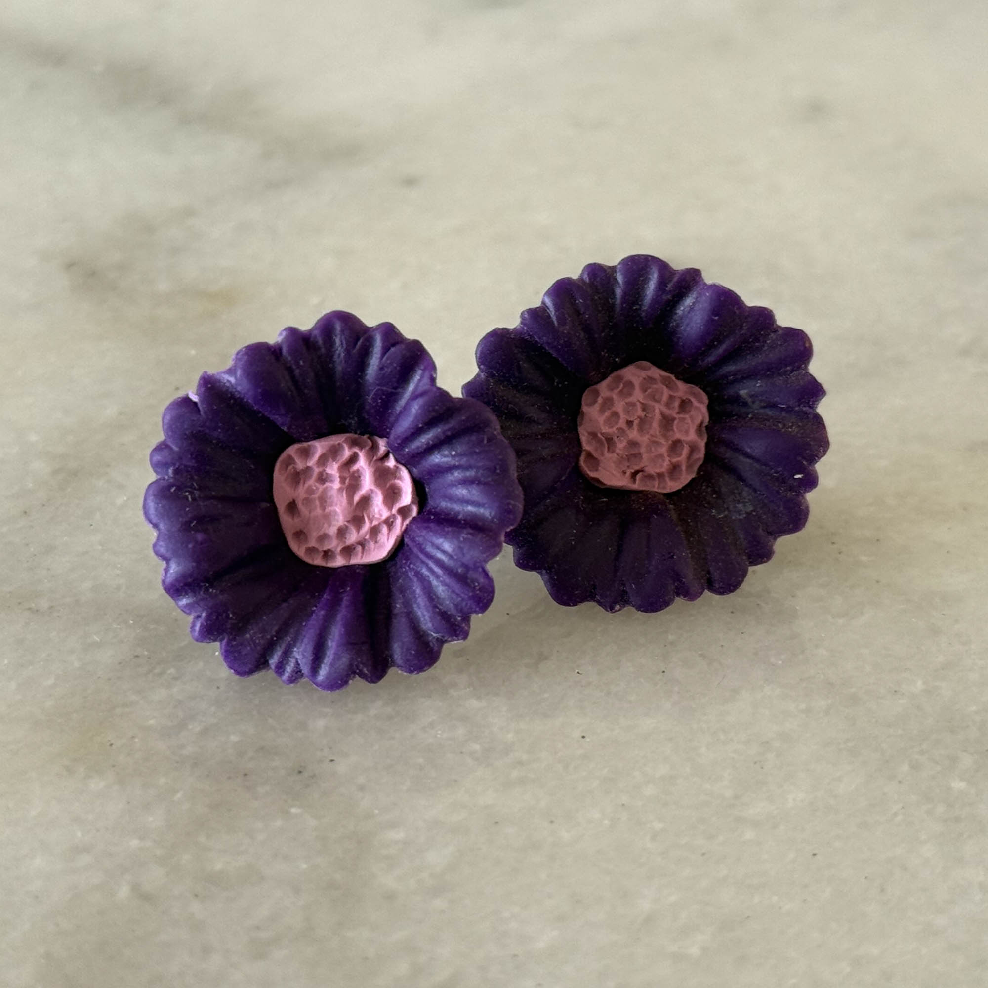 Dark purple daisy with light purple centre. Polymer clay on stainless steel post. Each earring weights 1.5 grams and measures 2.5cm diameter (approx). NOTE: Although all care is taken when photographing products, colours in photos may vary and not be an exact representation of the item.