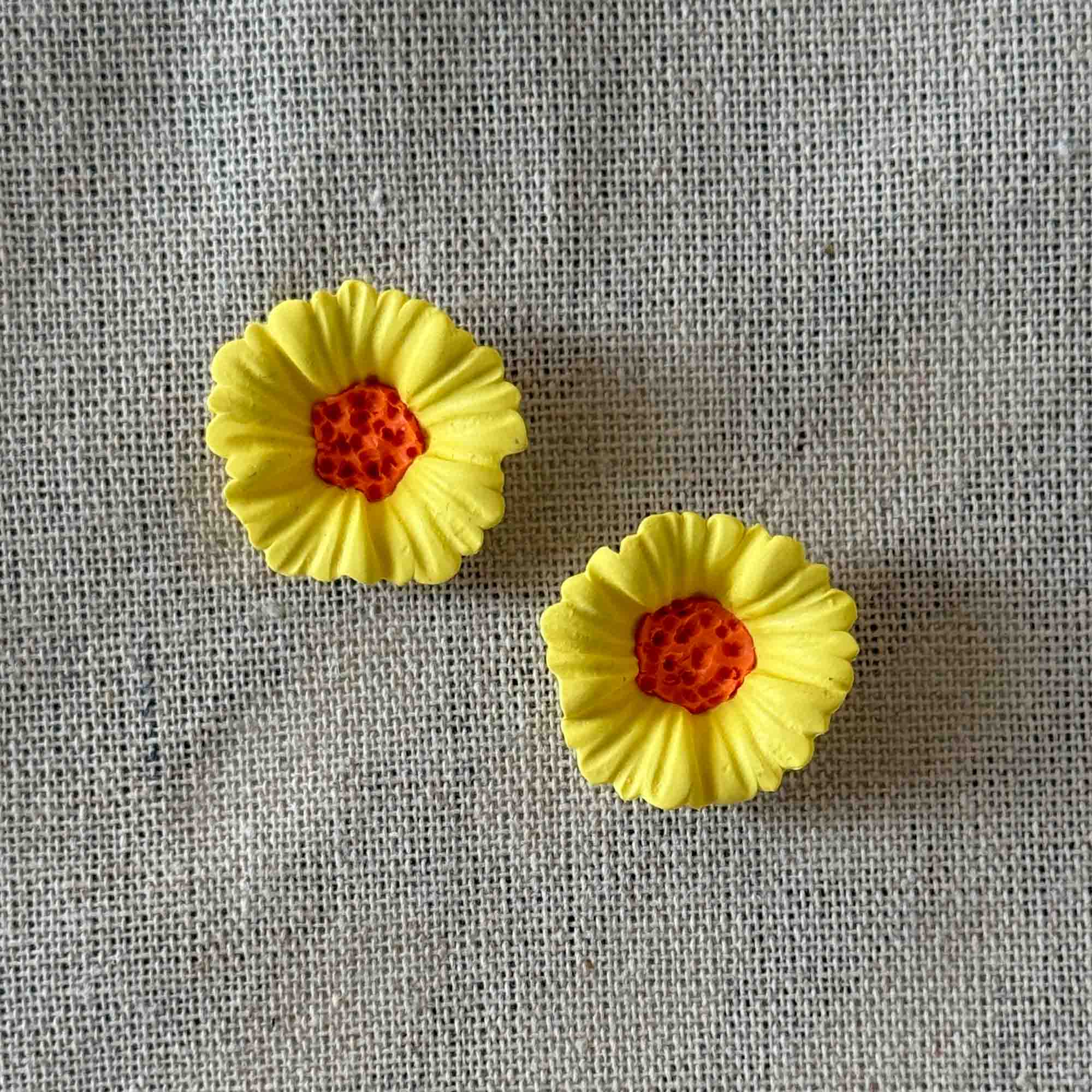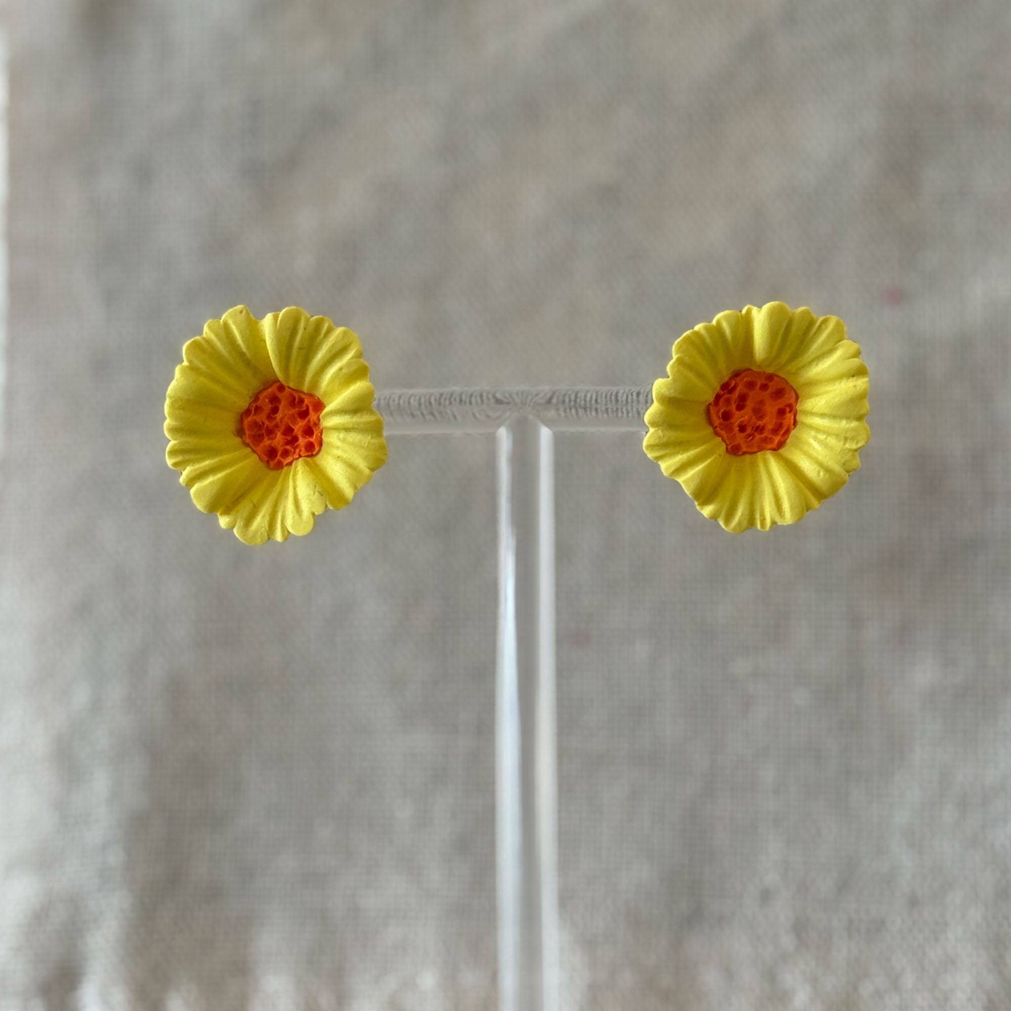Yellow daisy with orange centre. Each earring weights 1.5 grams and measures 2.5cm diameter (approx). Handmade using polymer clay and stainless steel posts. NOTE: Although all care is taken when photographing products, colours in photos may vary and not be an exact representation of the item.