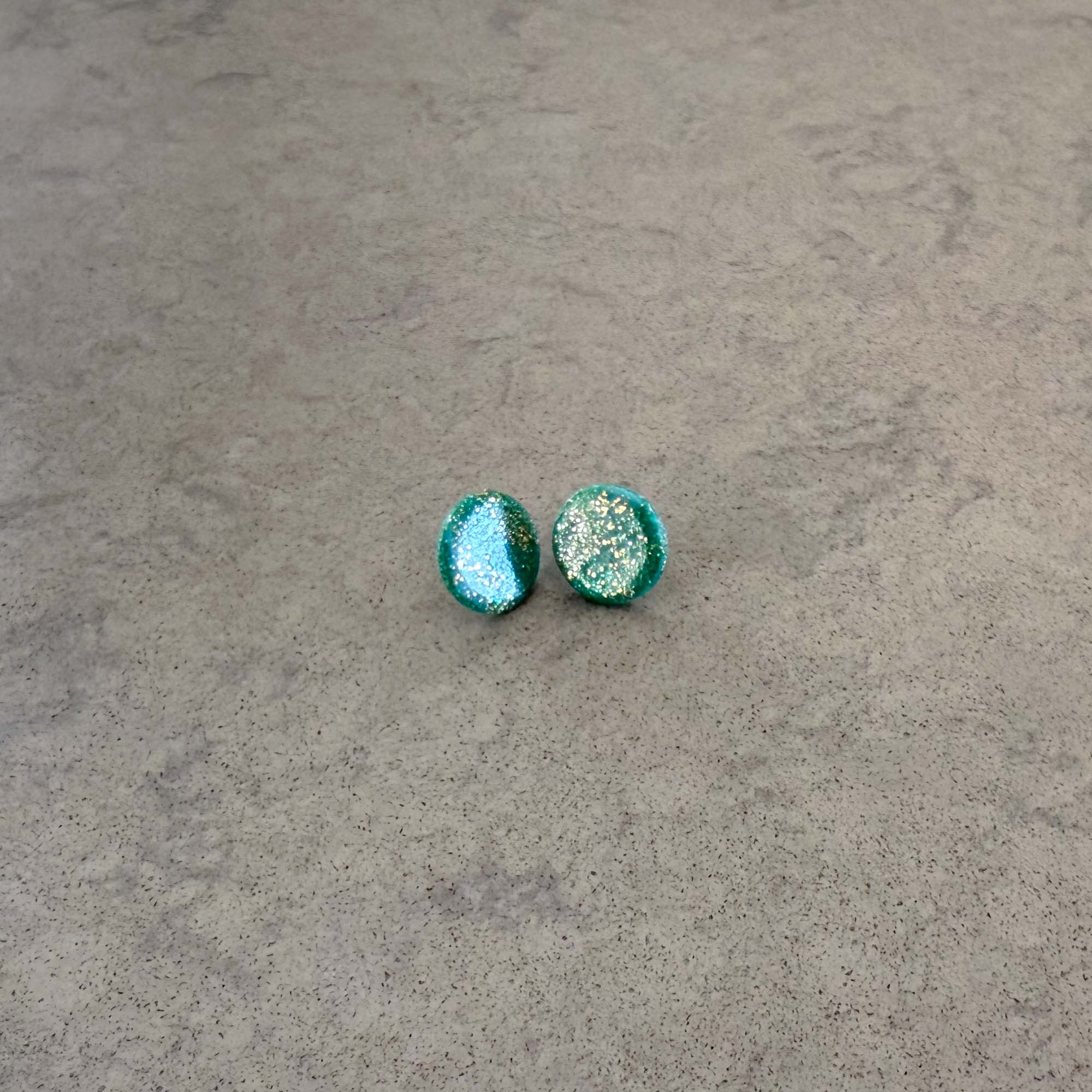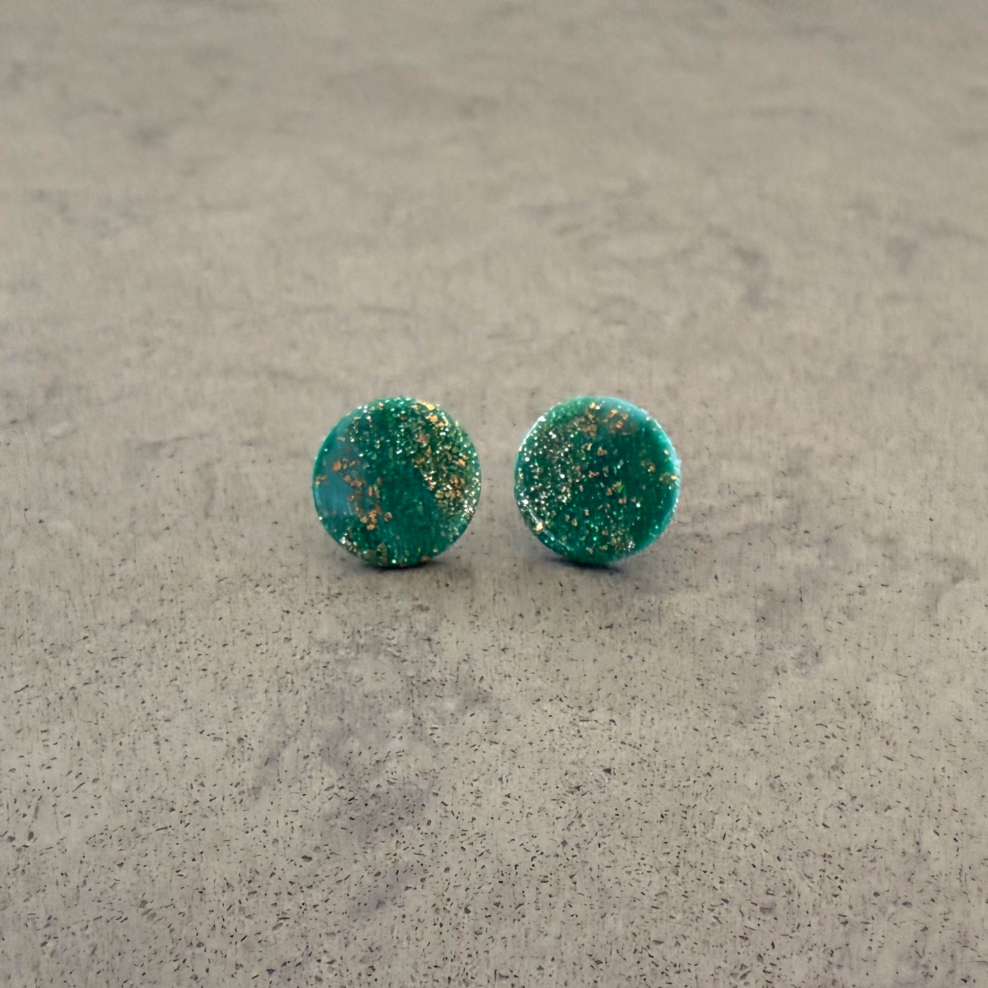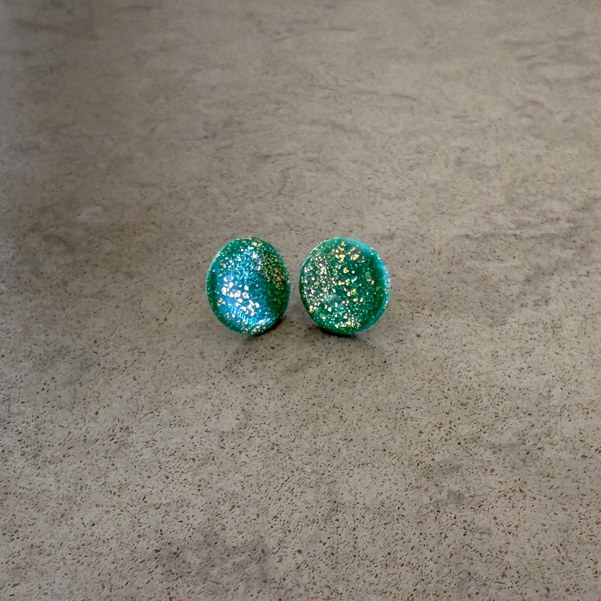 Medium sized round stud in green with gold sparkles on a gold stud back. Each earring weights less than 1 gram and measures 1.5 cm wide (approx). Made using polymer clay with stainless steel findings. NOTE: Although all care is taken when photographing products, colours in photos may vary and not be an exact representation…