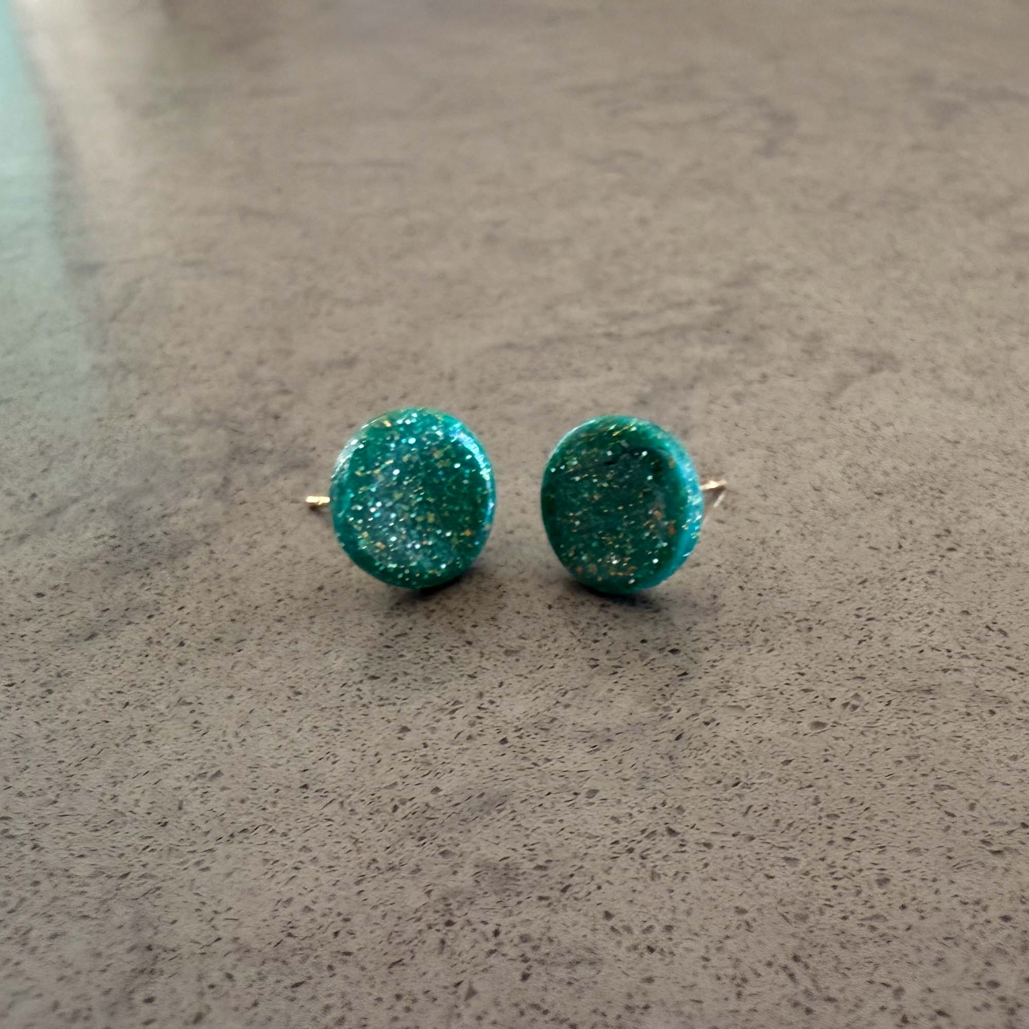 Small sized round stud in green with gold sparkles on a gold stud back. Each earring weights less than 1 gram and measures 1 cm wide (approx). Made using polymer clay with stainless steel findings. NOTE: Although all care is taken when photographing products, colours in photos may vary and not be an exact representation…