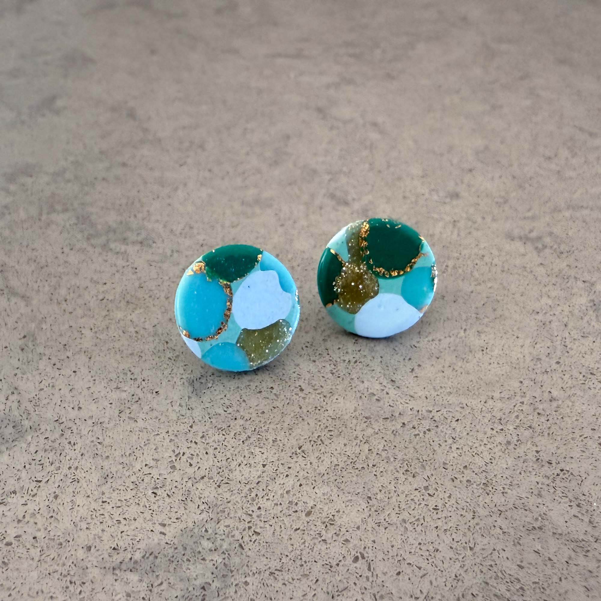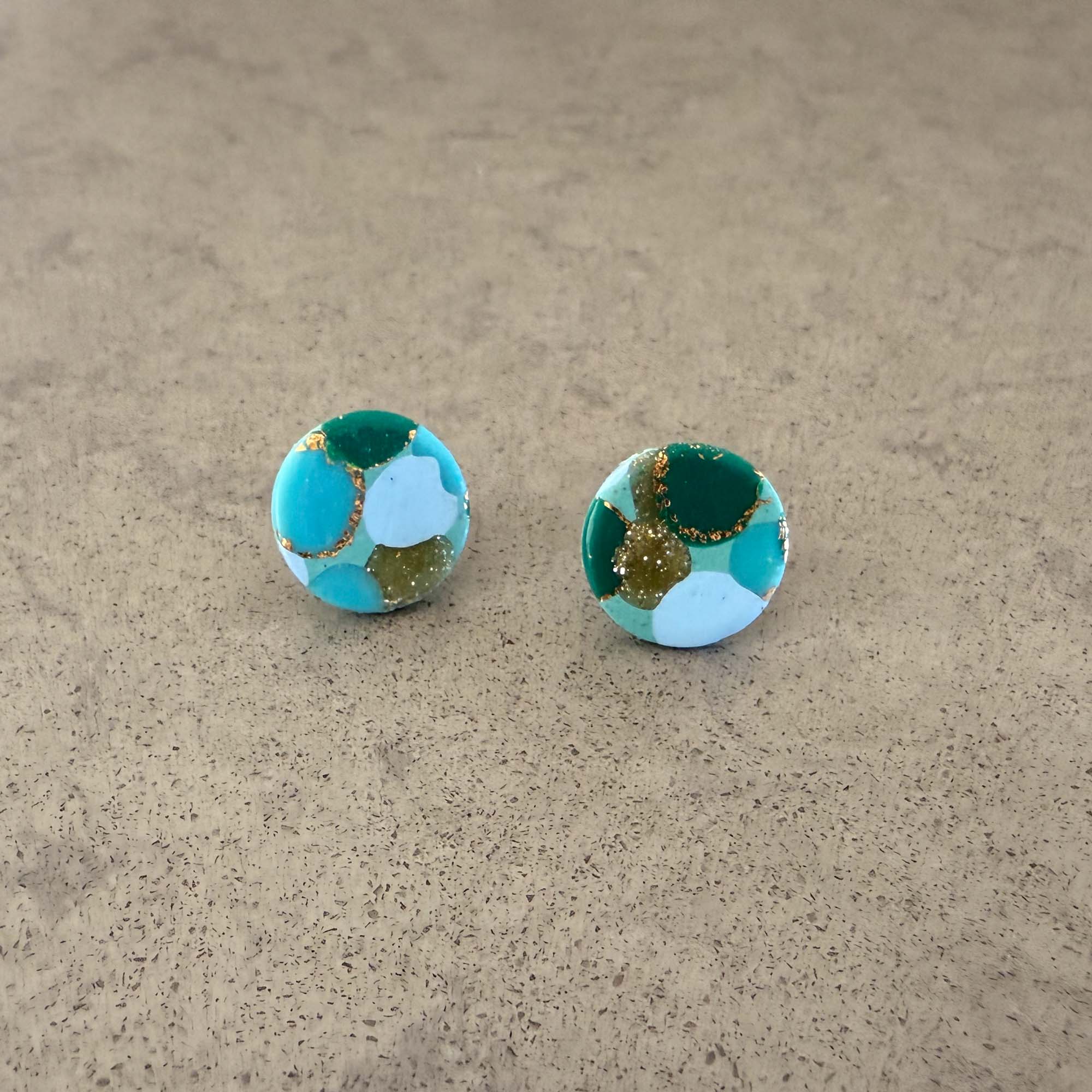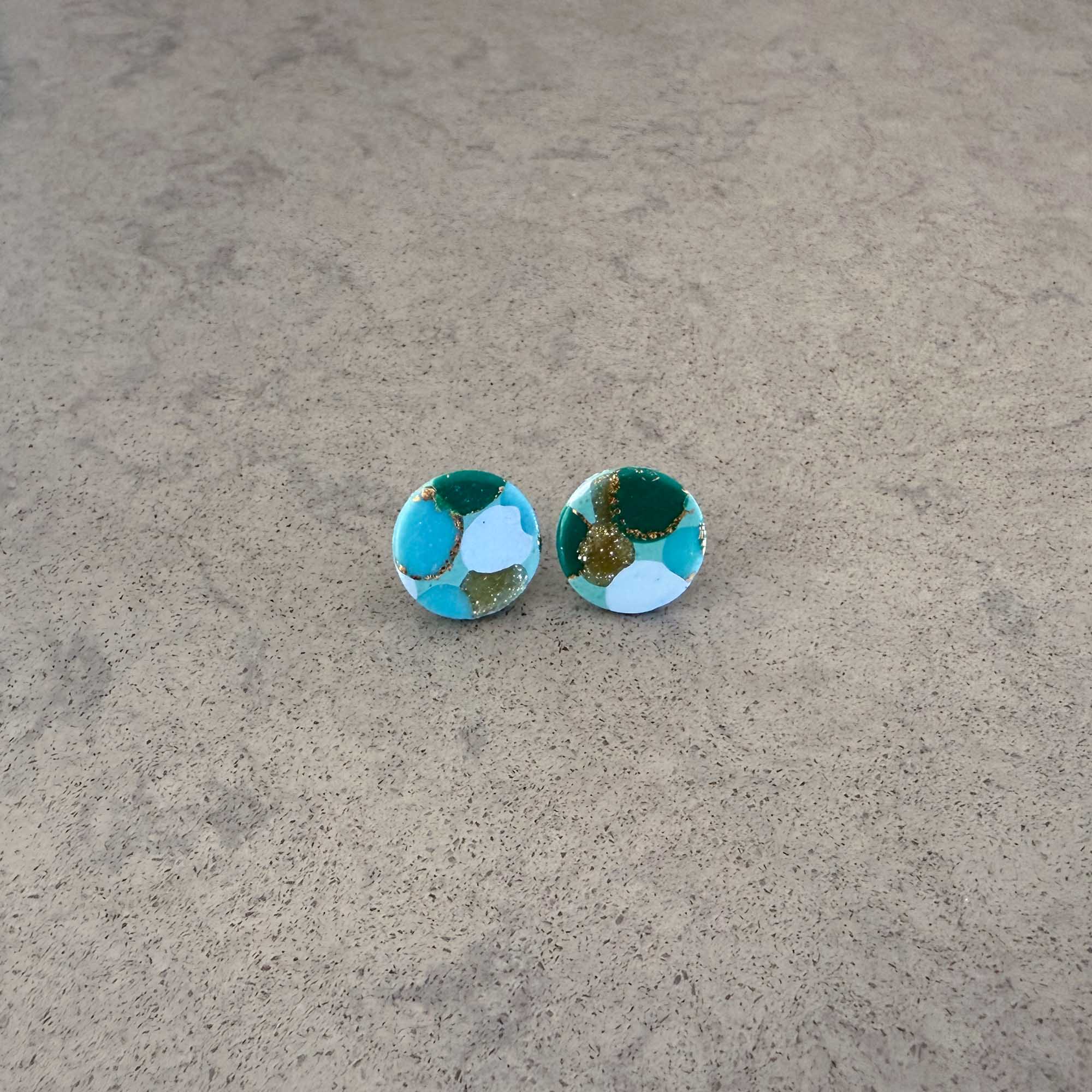 Medium sized round stud in blues and gold circle pattern with gold stud back. Each earring weights less than 1 gram and measures 1.5 cm wide/diameter (approx). Made using polymer clay with stainless steel findings. NOTE: Although all care is taken when photographing products, colours in photos may vary and not be an exact representation…