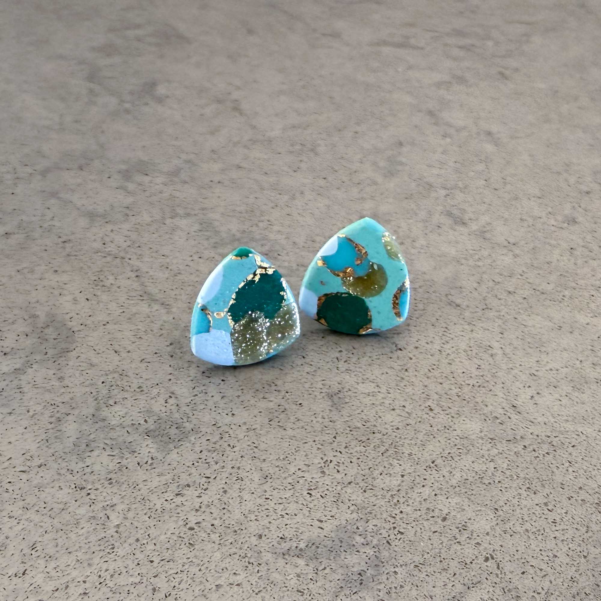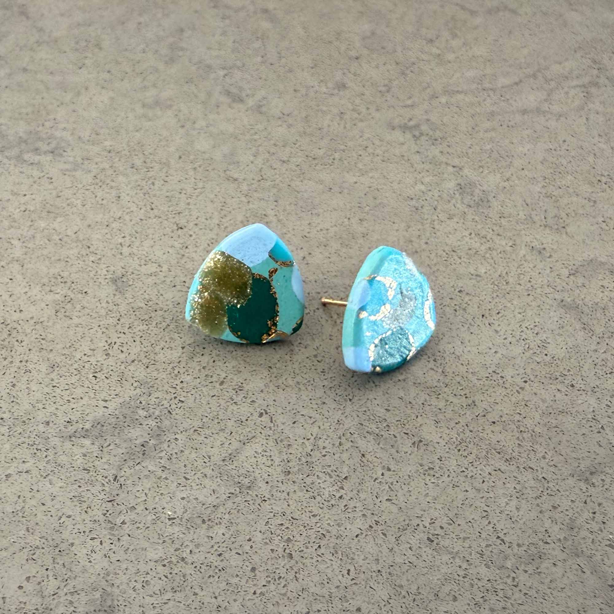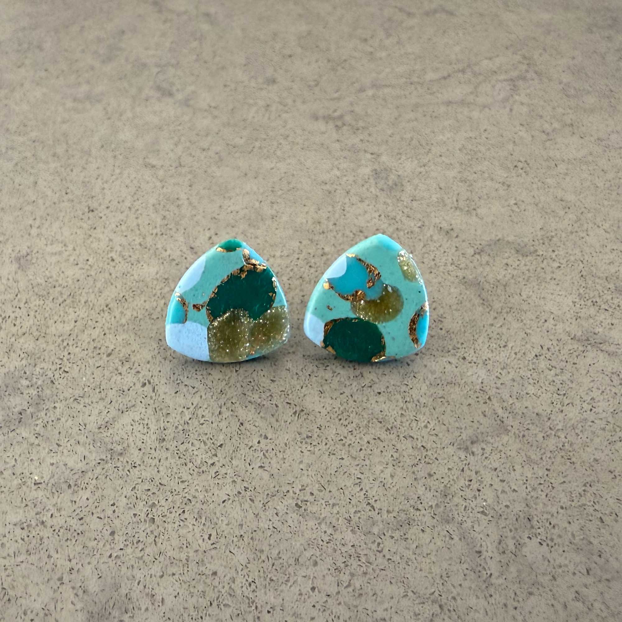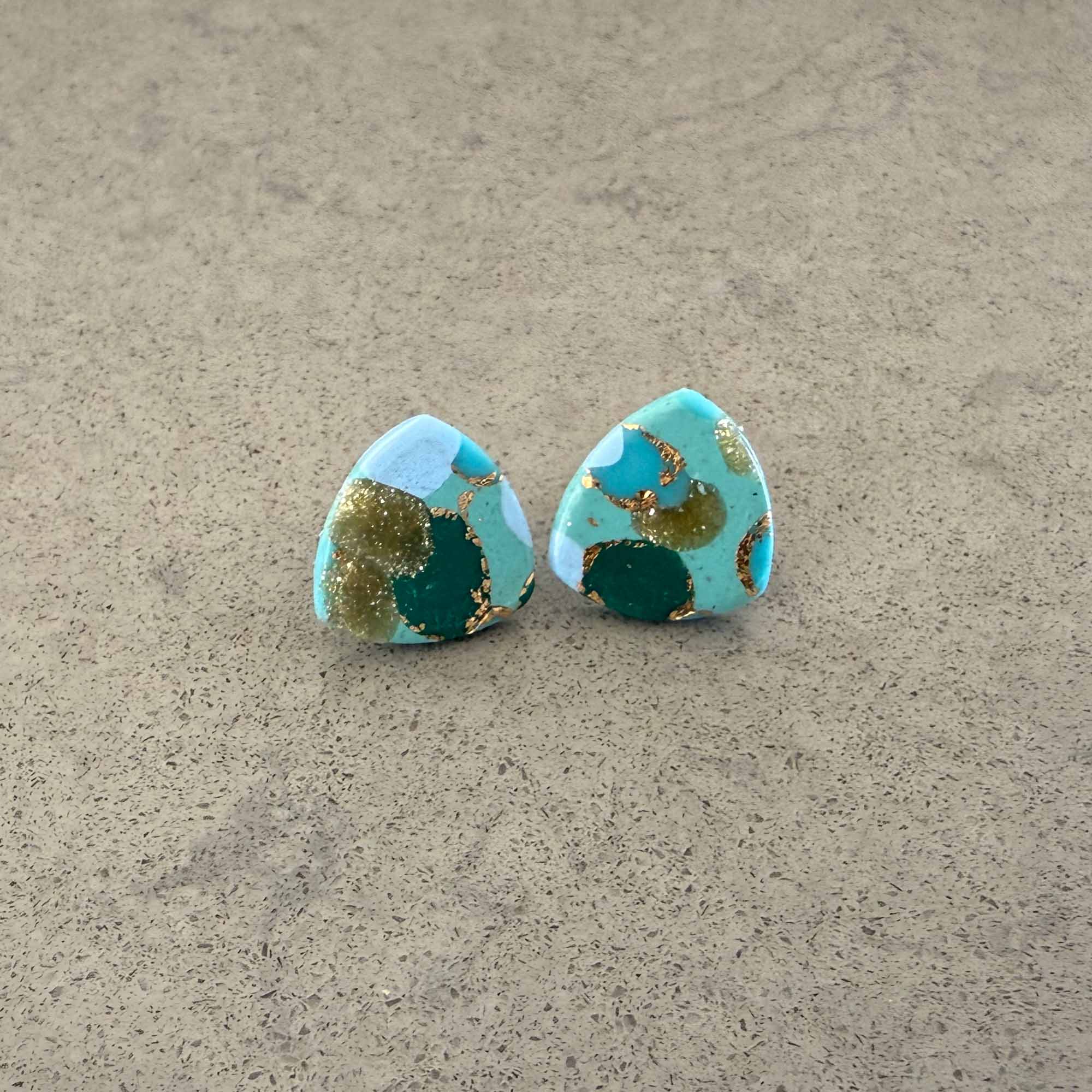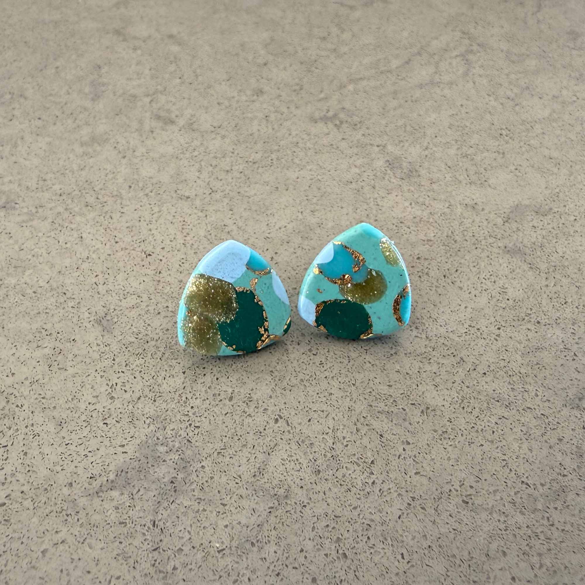 Medium/large sized square stud in blues, greens and golds circle pattern with gold stud back Each earring weights less than 1 gram and measures 1.5 cm wide (approx). Made using polymer clay with stainless steel findings. NOTE: Although all care is taken when photographing products, colours in photos may vary and not be an exact…