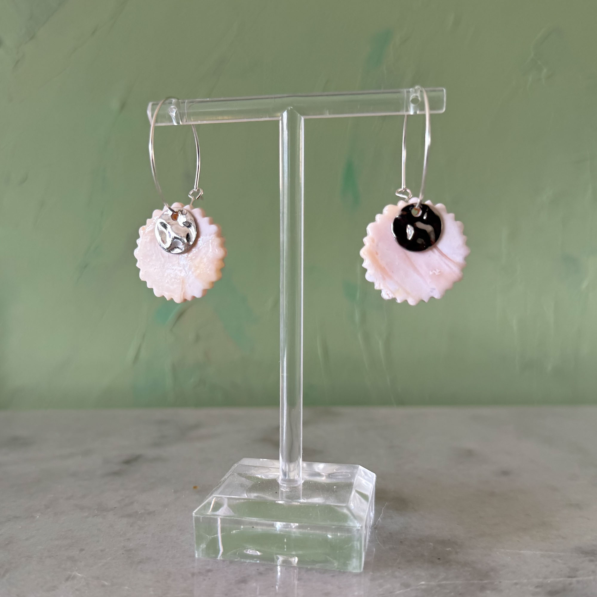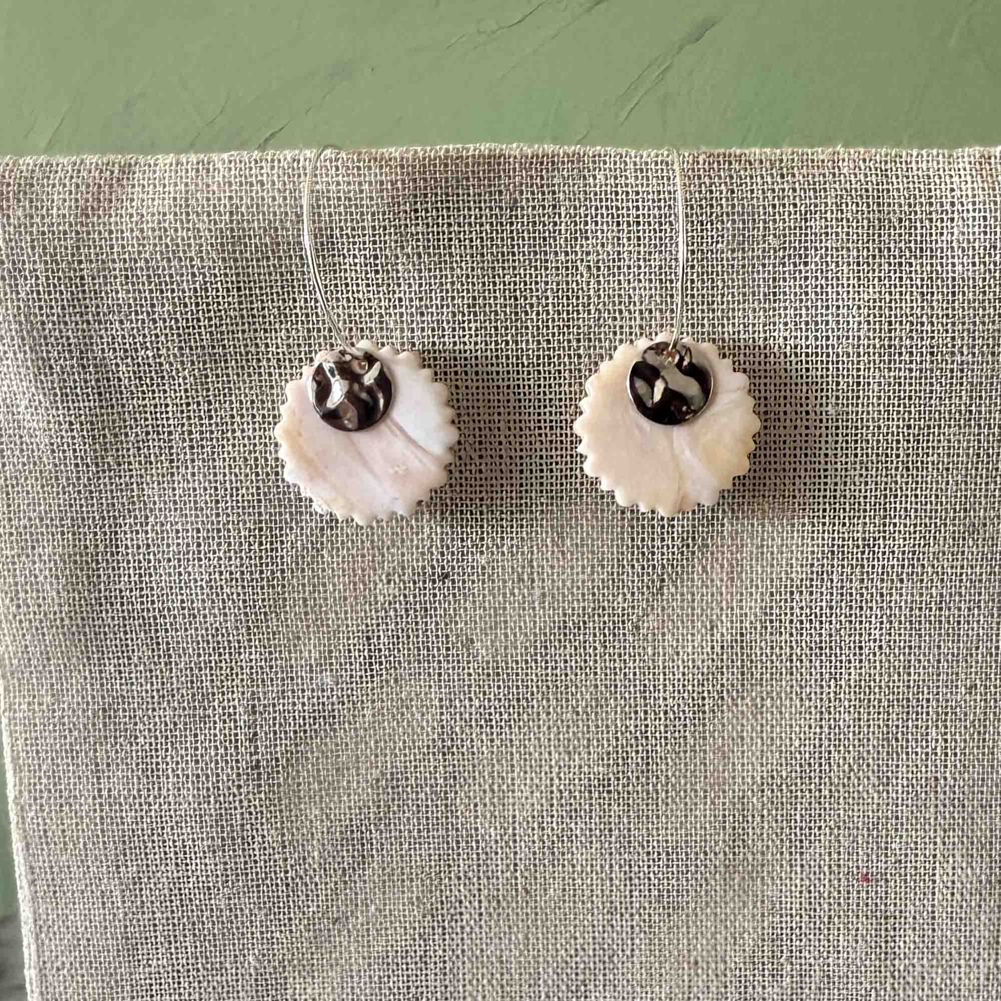 Medium circle dangle in shades of white and amber with hammered silver charm on silver hoops. Made using polymer clay with stainless steel findings. Each earring weights 1.5 grams and measures 4.3cm in length (approx). NOTE: Although all care is taken when photographing products, colours in photos may vary and not be an exact representation…