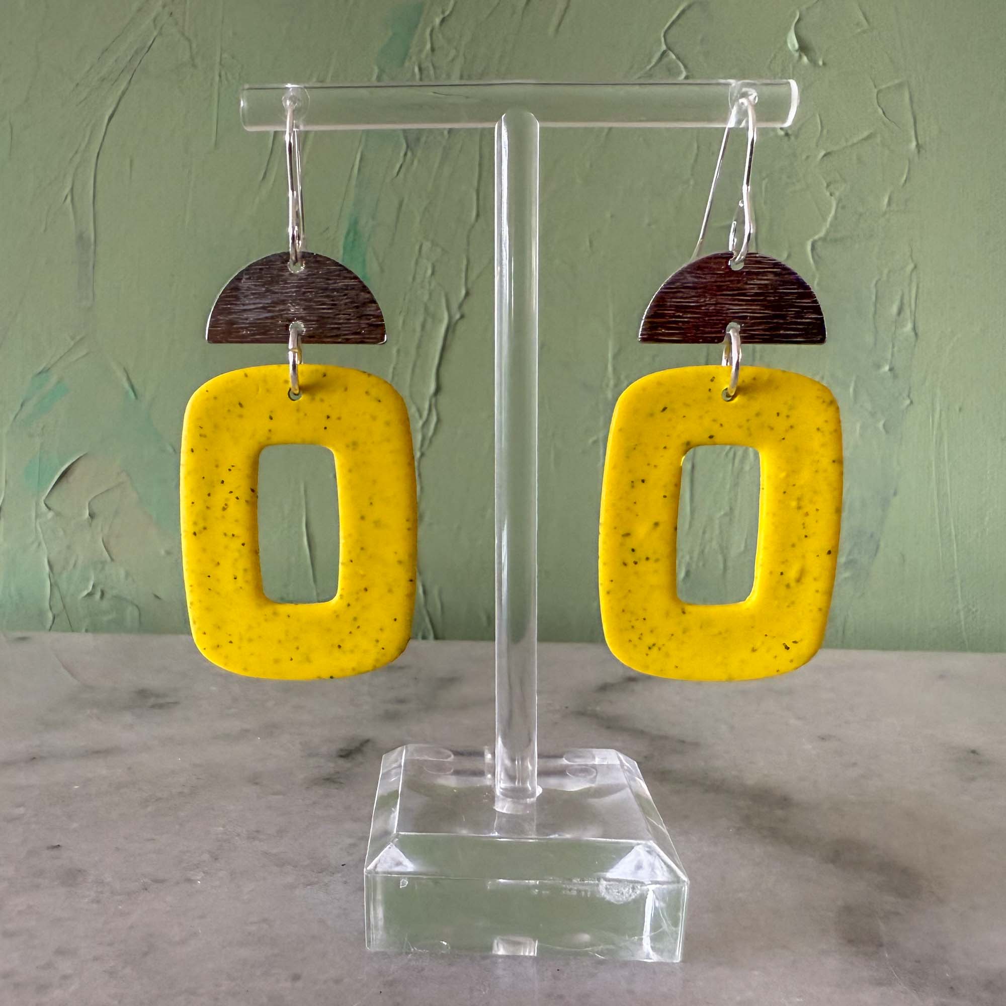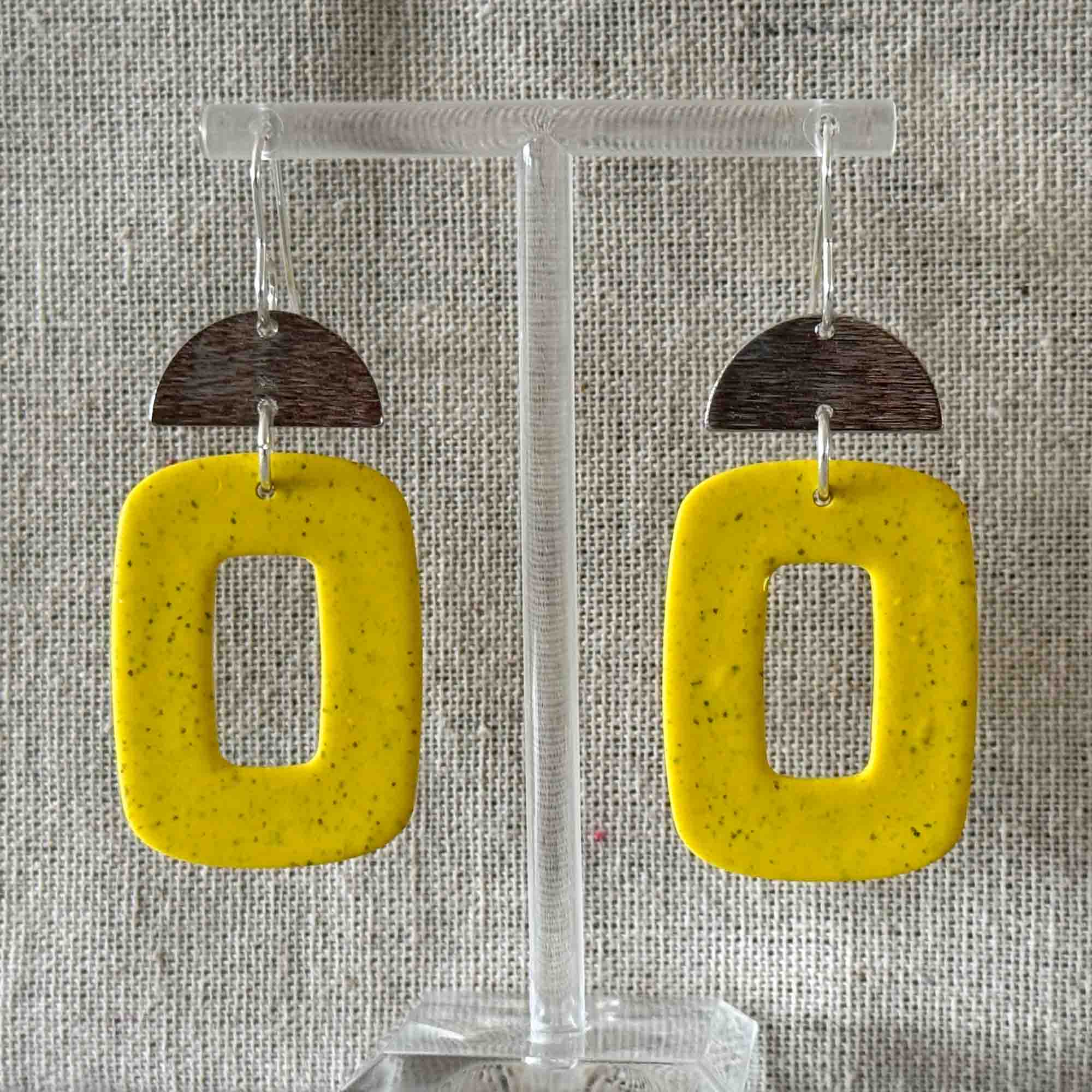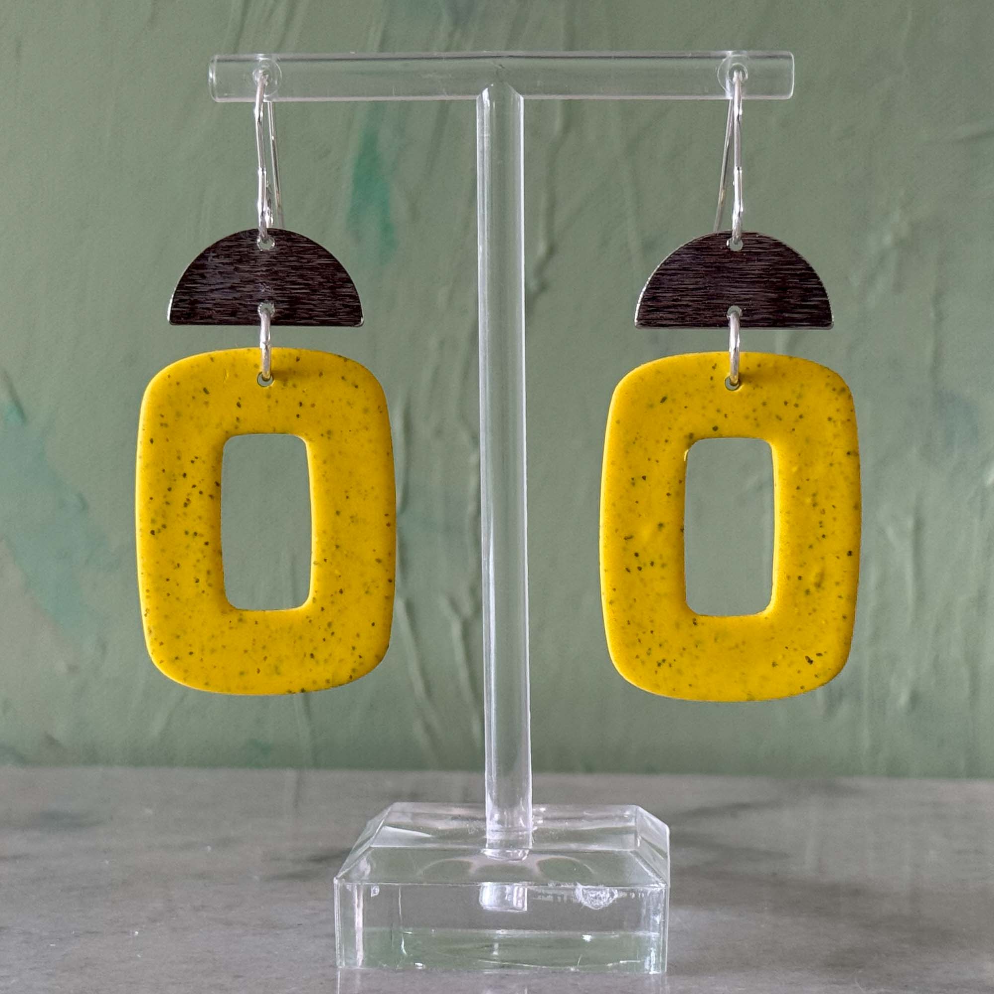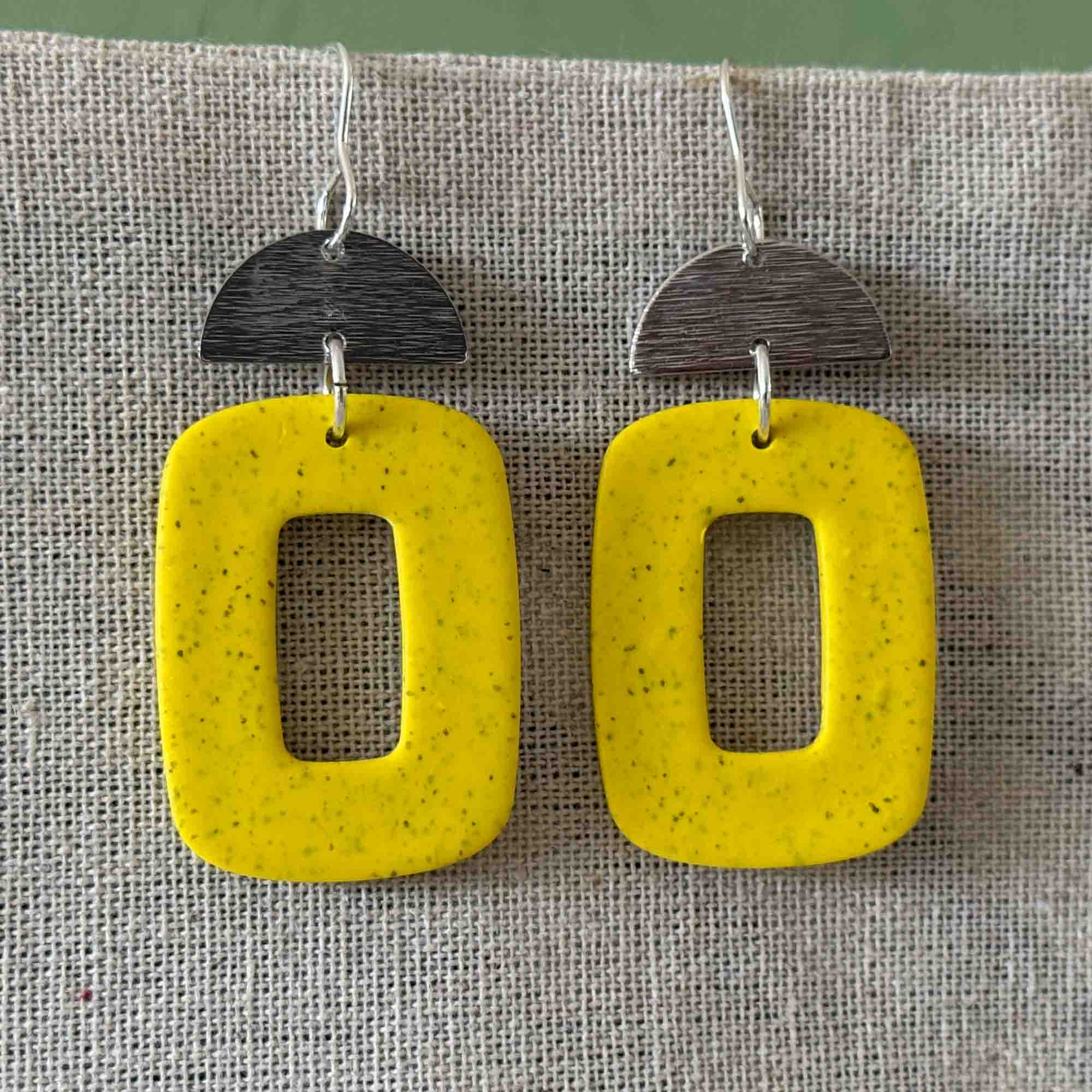 Yellow speck large hollow rectangle with half moon silver textured charm on silver hook. Made using polymer clay with stainless steel findings. Each earring weights 4 grams and measures 6.6 cm in length (approx). NOTE: Although all care is taken when photographing products, colours in photos may vary and not be an exact representation of…