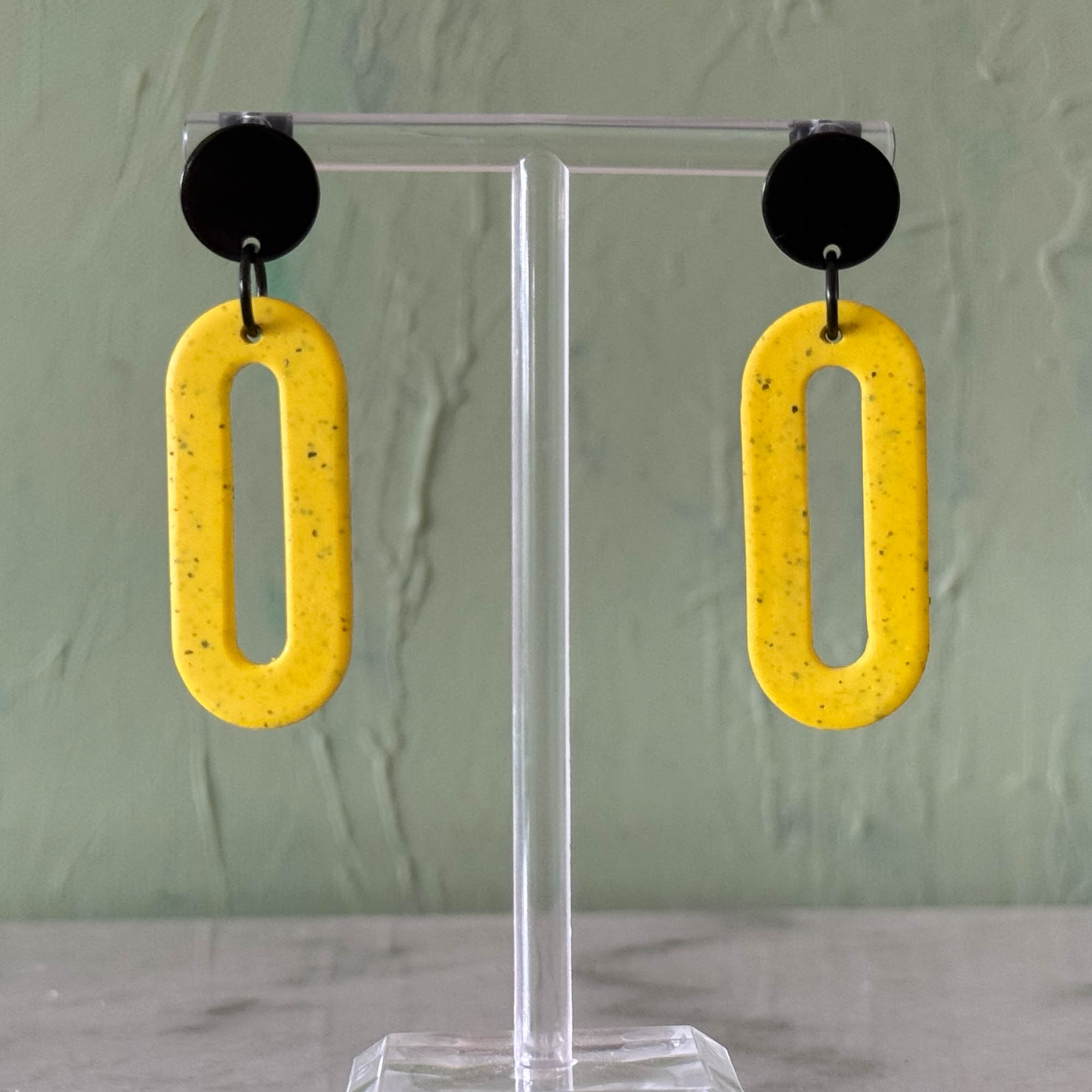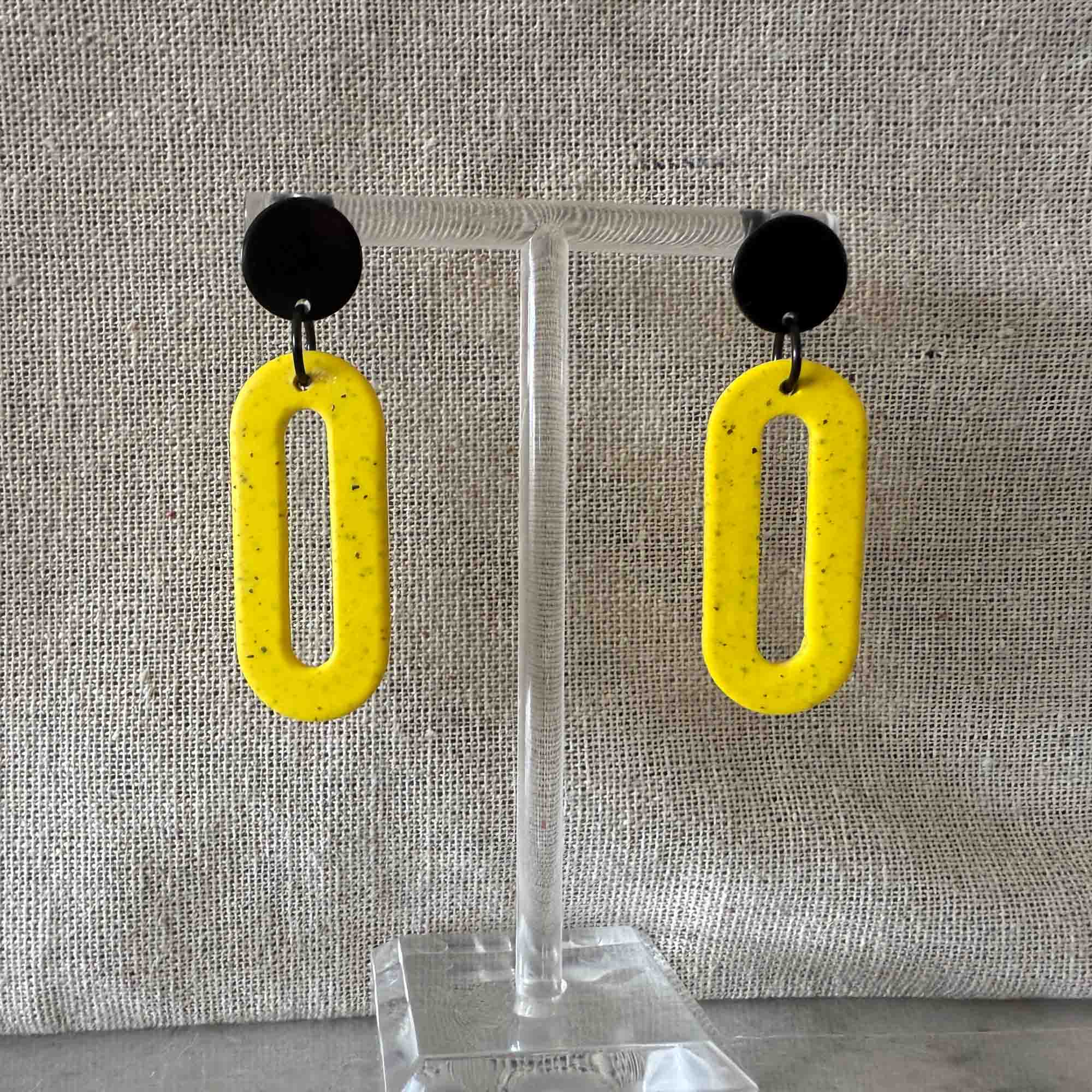 Yellow speck skinny hollow oval/rectangle on black stud. Made using polymer clay with stainless steel findings. Each earring weights 2 grams and measures 5 cm in length (approx). NOTE: Although all care is taken when photographing products, colours in photos may vary and not be an exact representation of the item.